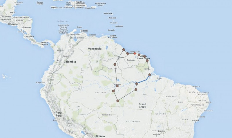 De geplande route is helemaal bekend en ook uitvoerbaar. Maar we gaan zeker op zoek naar een doorgaande track aan de noordoever van de Amazone (de oranje lijn). Uiteraard afhankelijk van de omstandigheden en de aanwezigheid van veerponten…