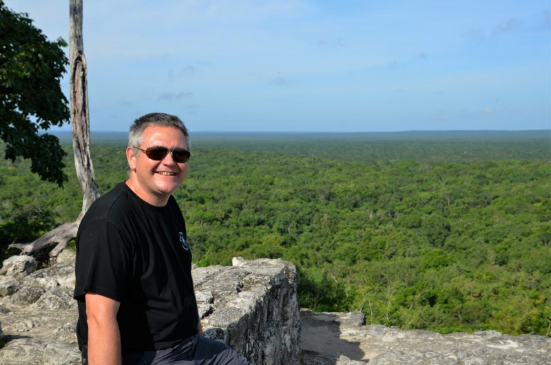 Van daar af moesten we te voet verder... door de jungle... een aap slingerde boven ons hoofd van de ene boom naar de andere, een specht tokte vol geduld op een boomstam... en uiteindelijk arriveerden we na een half uurtje bij de "grande Calakmul"... Het beklimmen was niet van de poes... 45 m hoog … de treden hadden een hoogte van 40 à 50 cm... niets voor kleine mensjes met korte beentjes... het mos maakte het zelfs een beetje glad... maar… wat een waanzinnig prachtig uitzicht daarboven... dwars over het oerwoud heen... ongelooflijk...!!