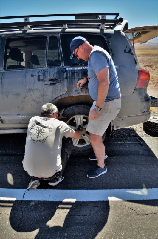 De rubber van de band was zo zacht dat we na 10 km weer moesten stoppen om de taphandeling te herhalen… dit gebeurde maar liefst nog 4 keer opnieuw vooraleer we ons hotel weer bereikten…