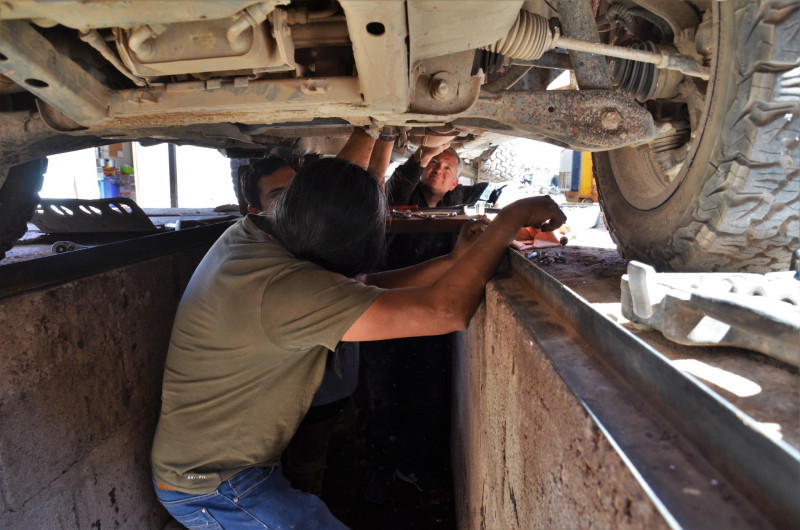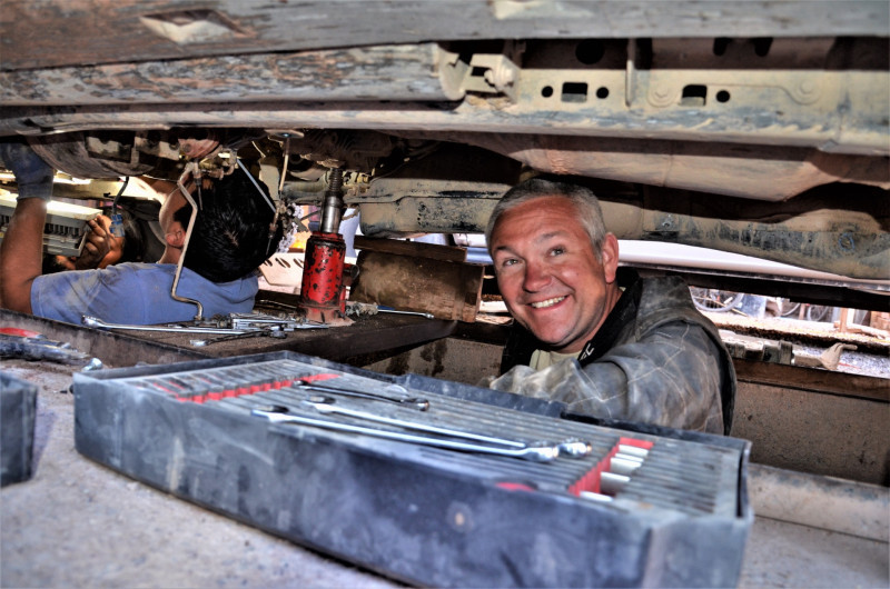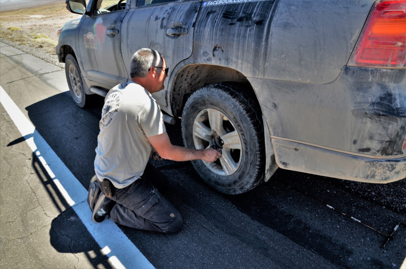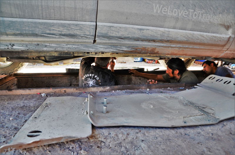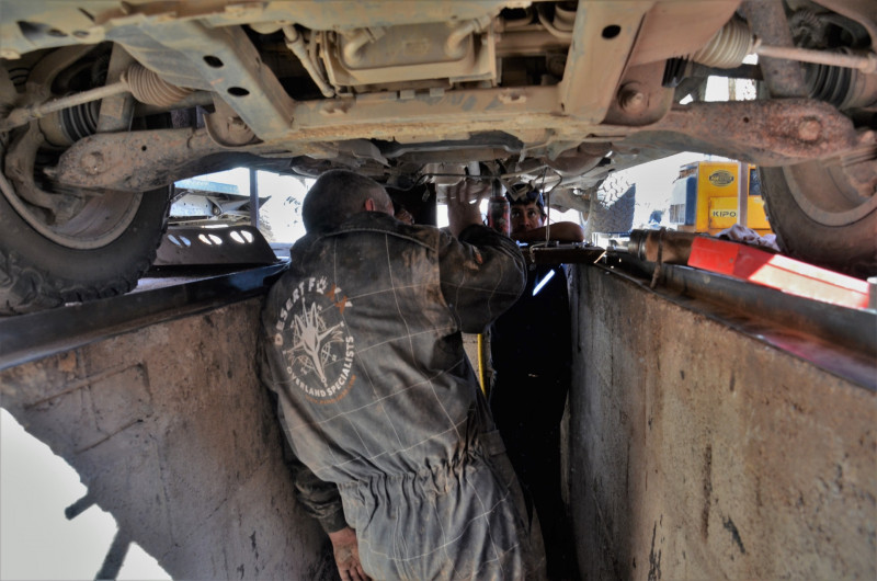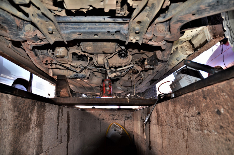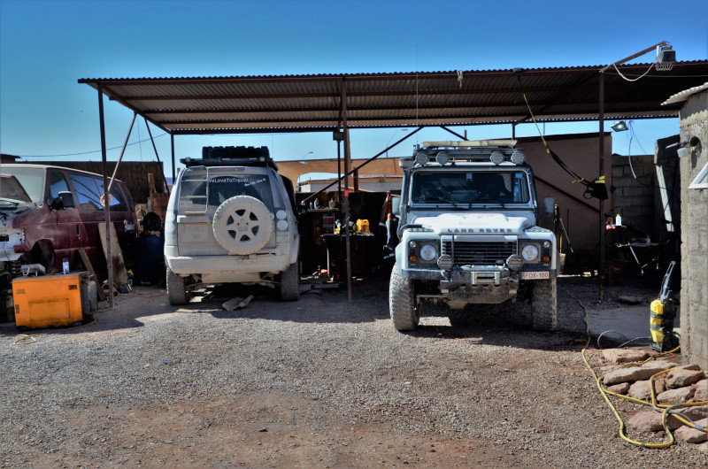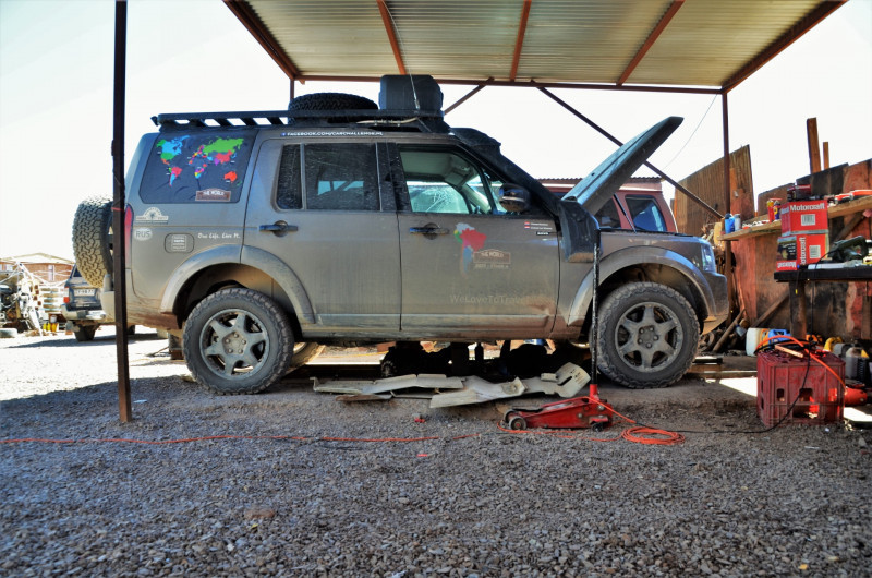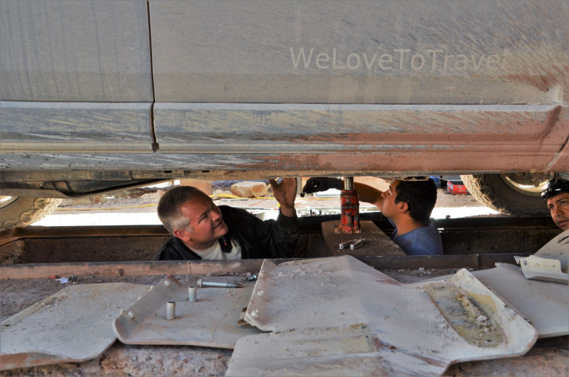 We gingen eerst op zoek naar een bandenboer die de 2 lekke banden van de Toyota kon repareren… helaas was het zondag en op deze Hoogdag was alles gesloten… toch vonden we een kleine bandenboer die open was… de banden werden afgezet en we gingen verder op zoek naar een garage met een autobrug of put…