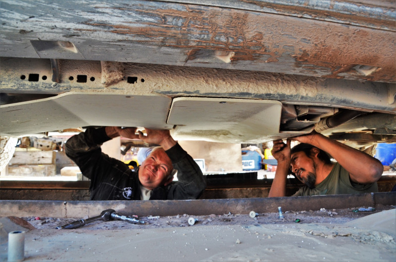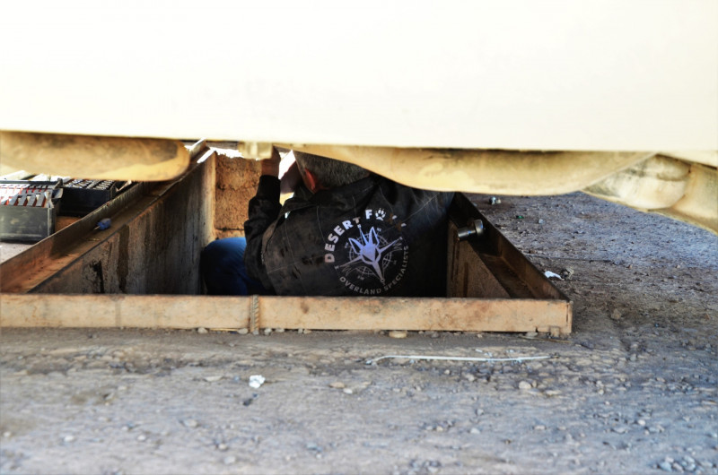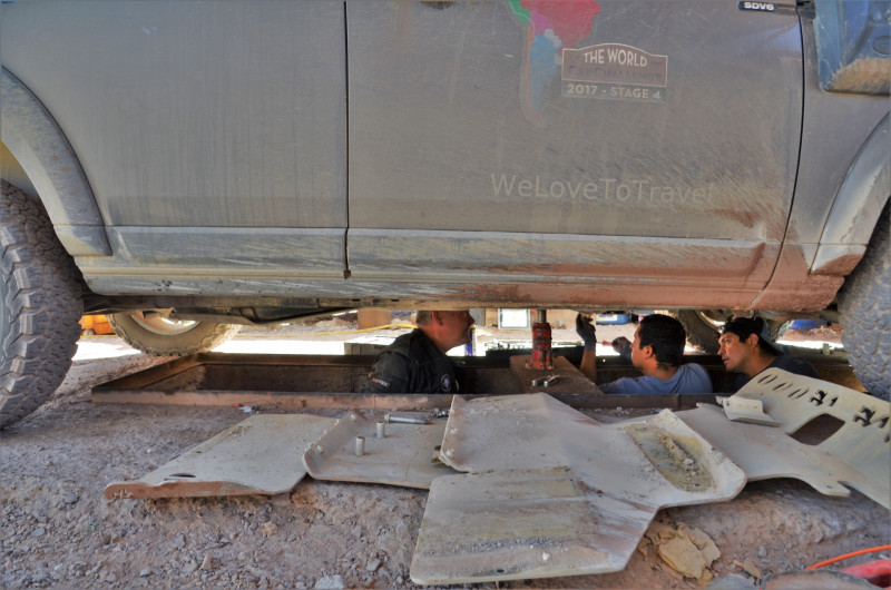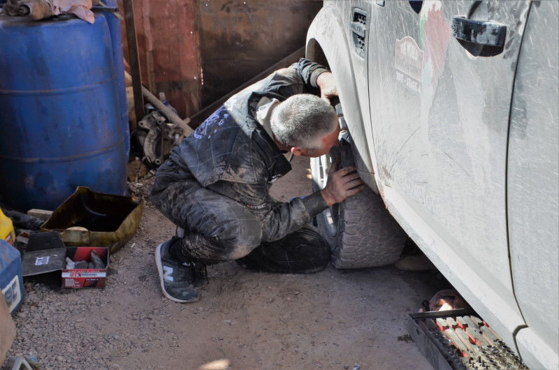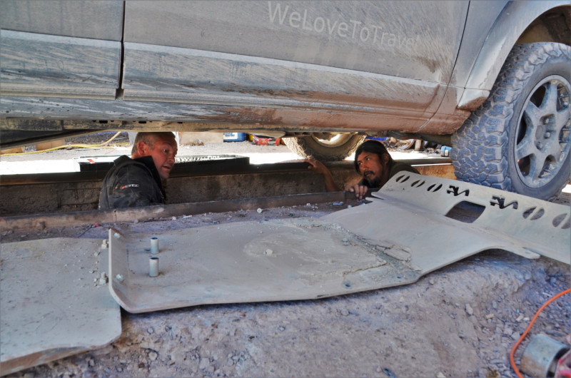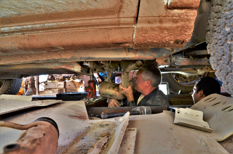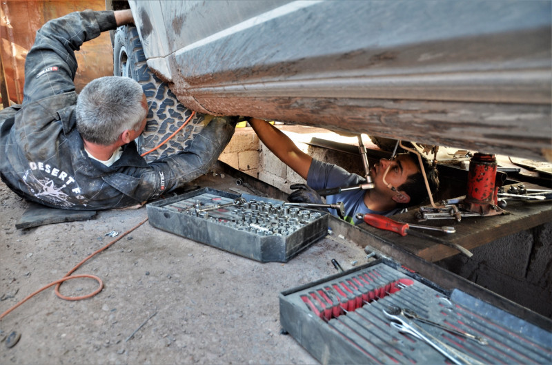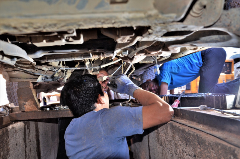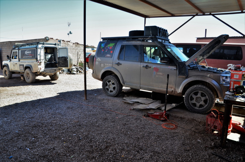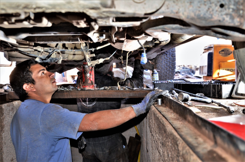 We gingen eerst op zoek naar een bandenboer die de 2 lekke banden van de Toyota kon repareren… helaas was het zondag en op deze Hoogdag was alles gesloten… toch vonden we een kleine bandenboer die open was… de banden werden afgezet en we gingen verder op zoek naar een garage met een autobrug of put…