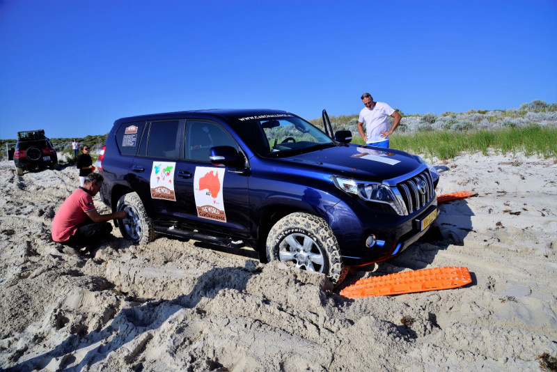 Het mulle zand verraste enkelen onder de deelnemers… Bas kreeg het zeer benauwd wanneer zijn Raptor muurvast stond en hij de zee sneller dan verwacht zag opkomen… Een paniekerige stem maakte duidelijk dat hij de eerste dag zou eindigen met een auto die zou verdrinken in het zeewater…