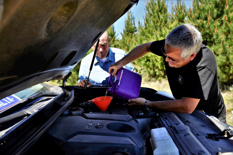 Een beetje verder stonden Bob en Monique stil… Bob had graag de diesel vanuit zijn jerrycans in de tank gegoten… Wouter sneed een plastieken fles kapot en tilde de eerst can in de auto en vervolgens een tweede….